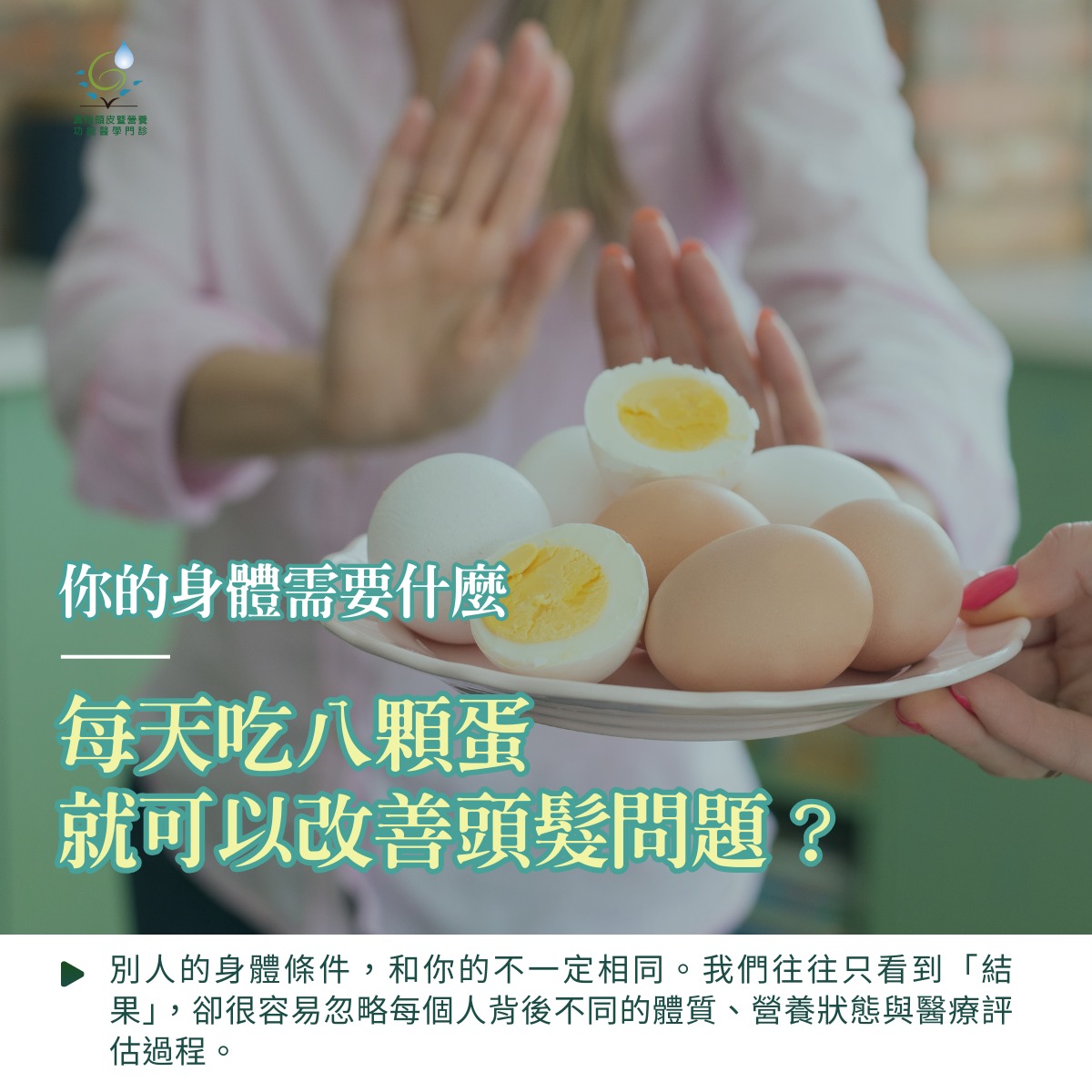 【內容摘要】 一天吃8顆蛋真的能改善掉髮嗎?並非每個人都適用。本文解析蛋白質補充原理、過敏風險與個人化評估重點,說明為何跟風飲食未必有效,幫助你從體質與數據出發,找到真正適合自己的改善方式。